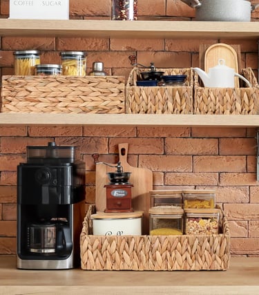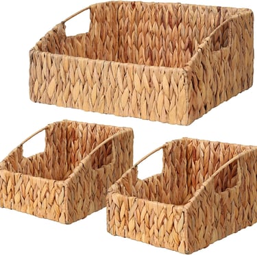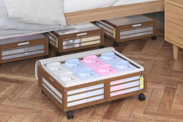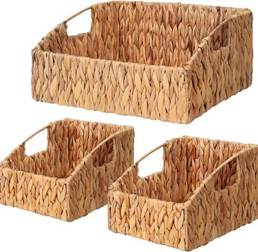 Keep your items organized with these wicker baskets for on your counter and shelves. These underbed bamboo containers on wheels are stackable. Great uses would be off season clothing, toys and books and craft items.